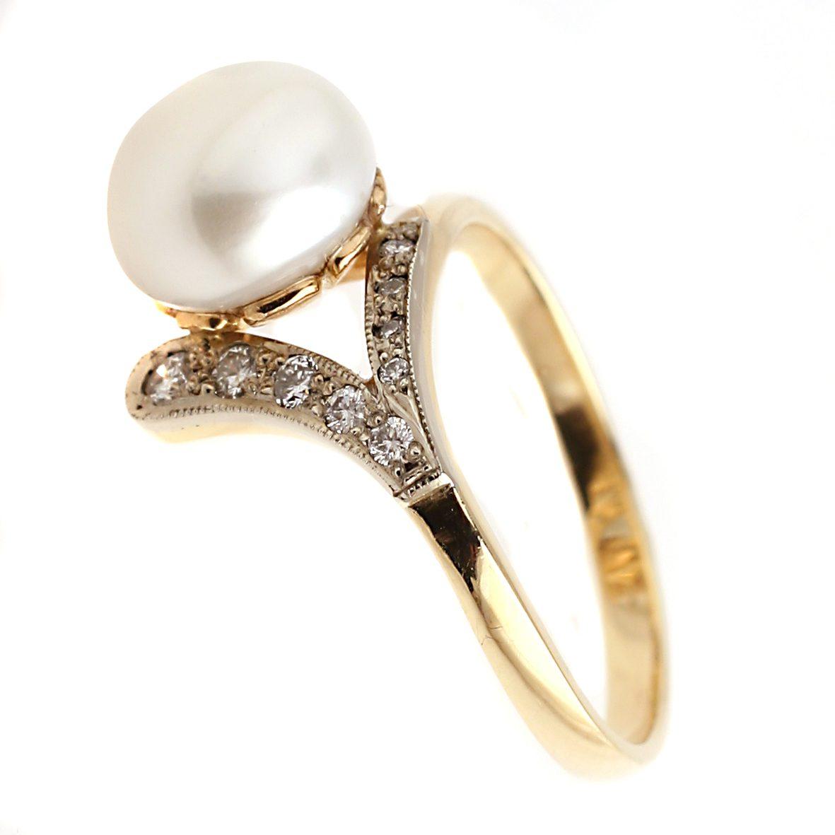 Konstrukcja pierścionka jest niezwykle finezyjna. Złota szyna rozwidla się ku górze, tworząc delikatne ramiona wysadzane brylantami, które podtrzymują perłę niczym kwiat. To projekt dla kobiety z klasą, która ceni subtelny luksus.